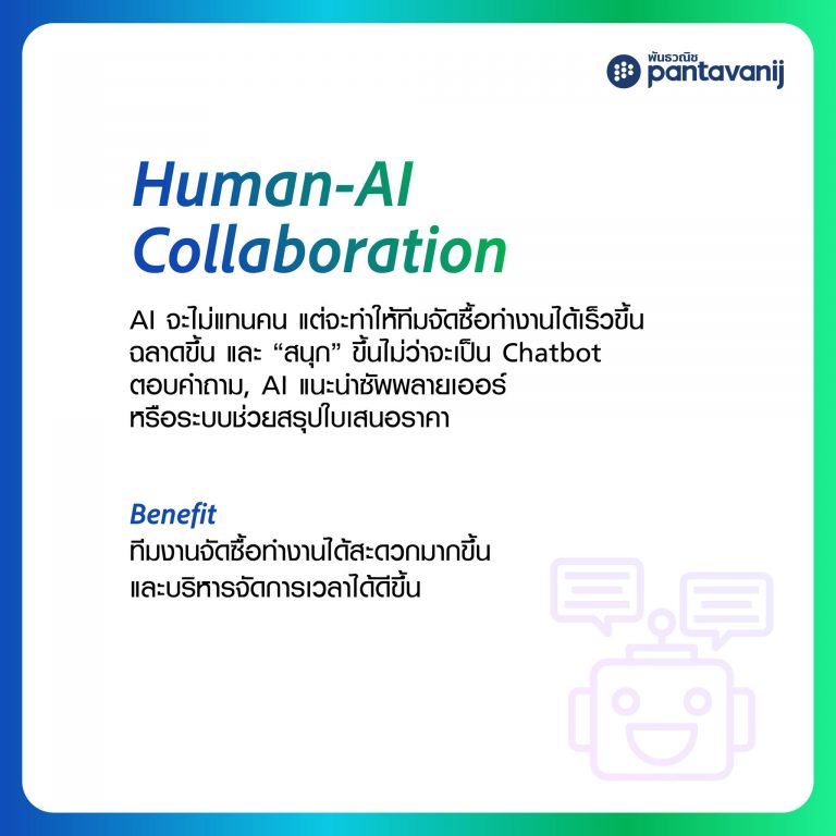 AI จะไม่แทนคน แต่จะทำให้ทีมจัดซื้อทำงานได้เร็วขึ้น ฉลาดขึ้น และ “สนุก” ขึ้นไม่ว่าจะเป็น Chatbot ตอบคำถาม, AI แนะนำซัพพลายเออร์ หรือระบบช่วยสรุปใบเสนอราคา