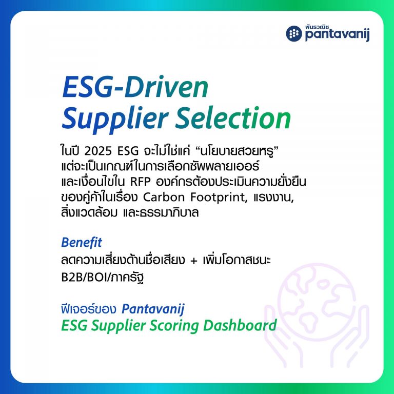 ในปี 2025 ESG จะไม่ใช่แค่ “นโยบายสวยหรู” แต่จะเป็นเกณฑ์ในการเลือกซัพพลายเออร์ และเงื่อนไขใน RFP องค์กรต้องประเมินความยั่งยืนของคู่ค้าในเรื่อง Carbon Footprint, แรงงาน, สิ่งแวดล้อม และธรรมาภิบาล