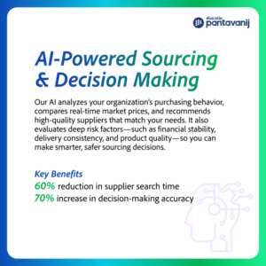 🔹 Our AI analyzes your organization’s purchasing behavior, compares real-time market prices, and recommends high-quality suppliers that match your needs. It also evaluates deep risk factors—such as financial stability, delivery consistency, and product quality—so you can make smarter, safer sourcing decisions.
