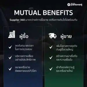 Supplier 360 จาก Pantavanij คือบริการที่เข้ามาเปลี่ยนโฉมการบริหารจัดการคู่ค้า โดยทำหน้าที่เป็นตัวกลางเชื่อมโยงผู้ซื้อและผู้ขายที่มีคุณภาพเข้าด้วยกัน ผ่านระบบการตรวจสอบข้อมูลที่โปร่งใส ตรวจสอบได้ และครบวงจร