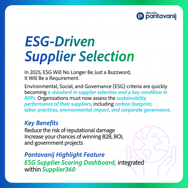 Environmental, Social, and Governance (ESG) criteria are quickly becoming a standard in supplier selection and a key condition in RFPs. Organizations must now assess the sustainability performance of their suppliers, including carbon footprint, labor practices, environmental impact, and corporate governance.